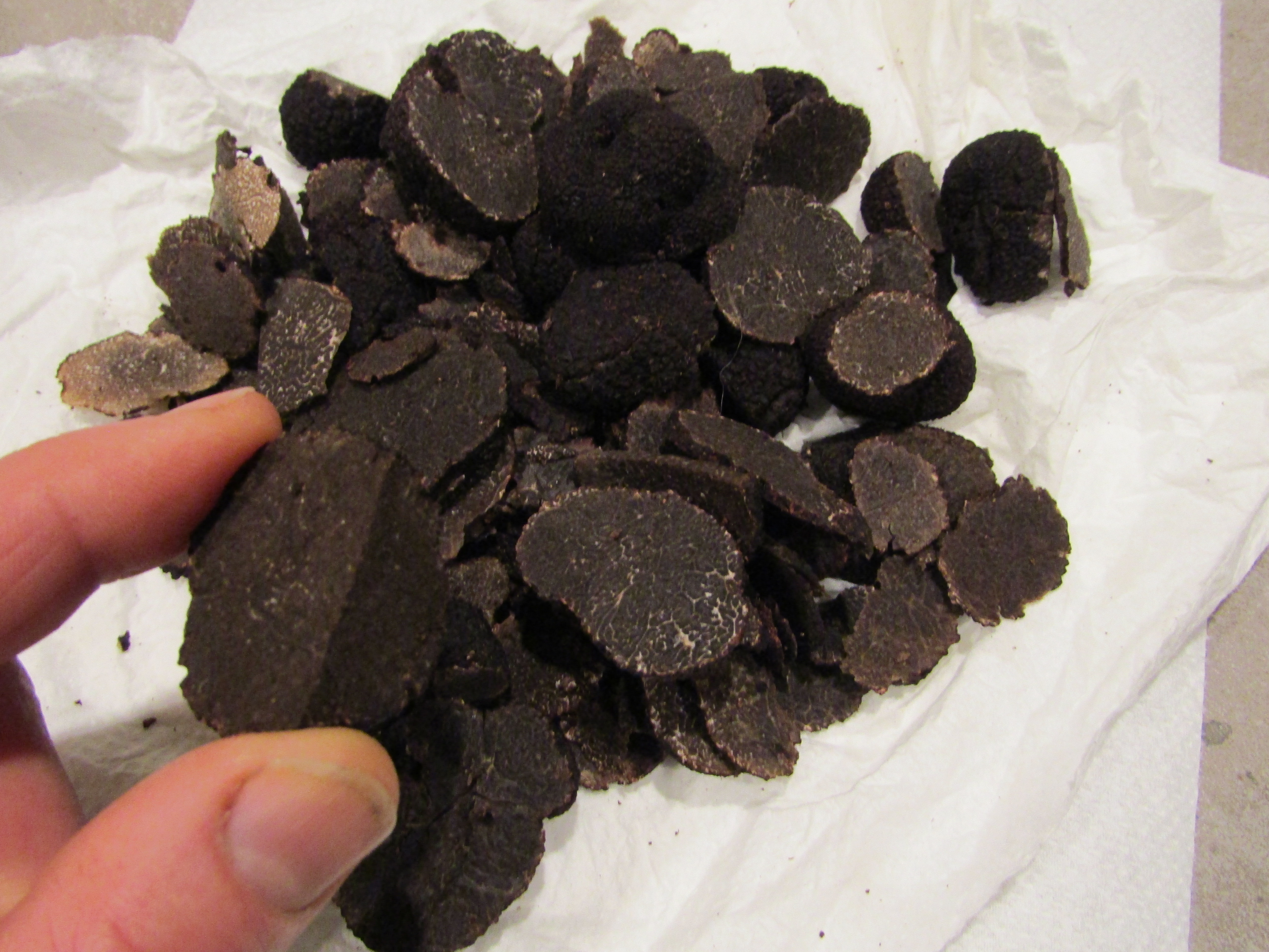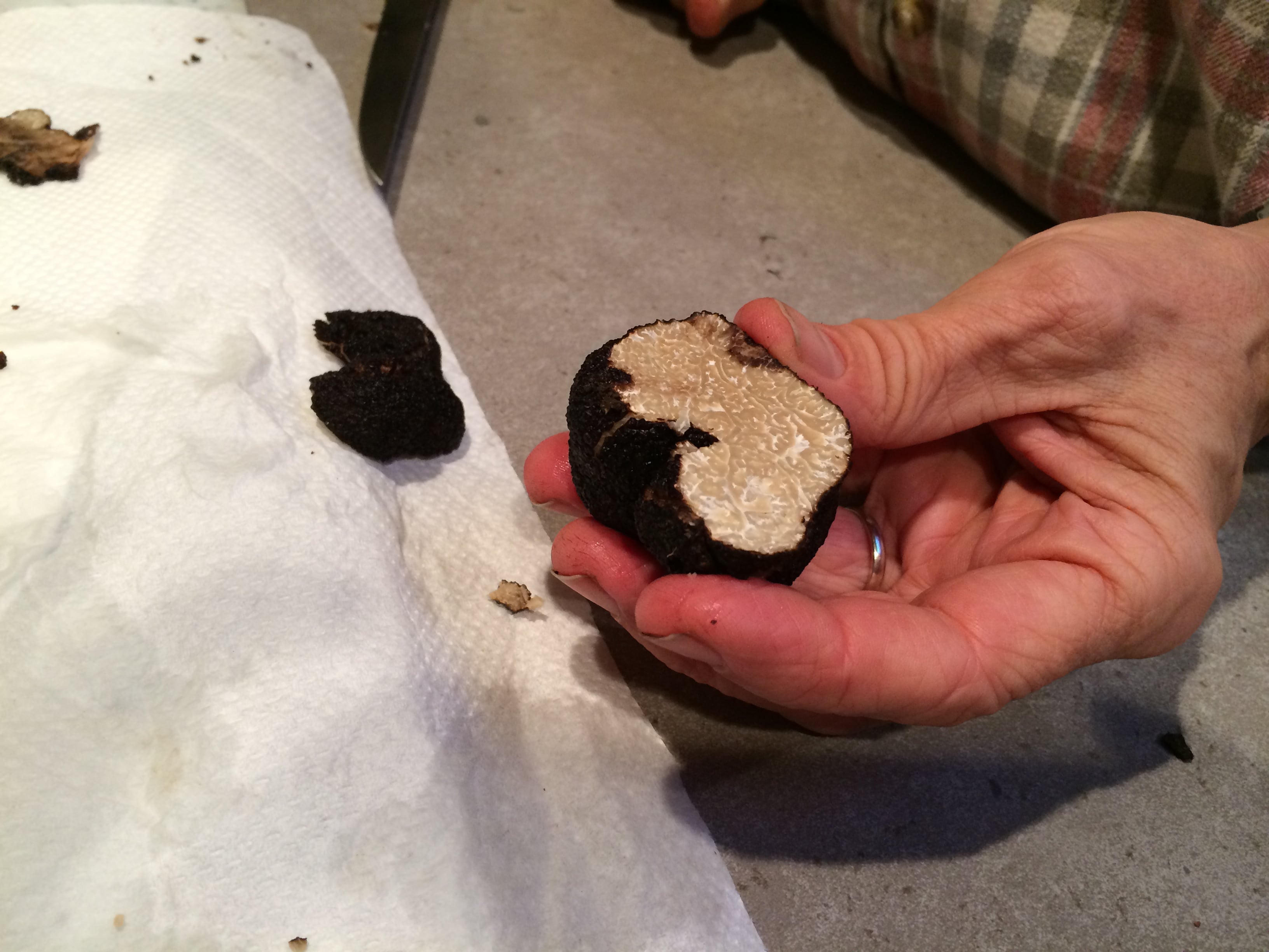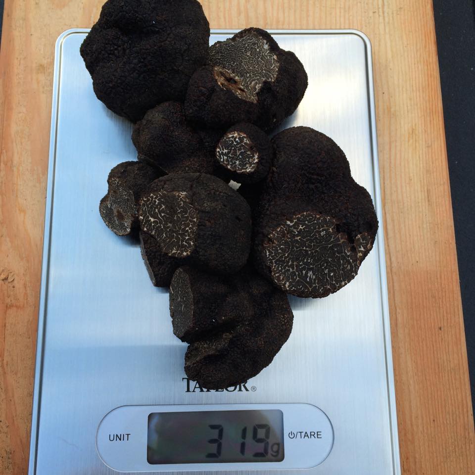 Burgundy truffle is the autumn variety of Tuber aestivum, the summer truffle. Its period of ripeness is from late August through November. It has a dark brown, rough skin with a velvety chocolate coloured interior. Ours are generally larger than our Périgords with a less intense flavour. The aroma fills your nostrils with earthy, musky aroma and delicate flavours of hazelnut. A very nice truffle to serve.